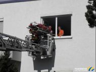 Mit Hilfe der Tragenhalterung der DLK wurde die Person gemeinsam mit dem Rettungsdienst aus dem 1 OG gerettet und an den Rettungshubschrauber übergeben.