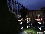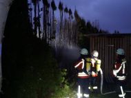 Der gemeldet Dachstuhlbrand entpuppte sich vor Ort als brennende Thuja Hecke welche aufgrund ihrer Größe zu einem anfängliche enormen Feuerschein und Funkenflug führte. Der Brand wurde unter Atemschutz mit einem C Rohr gelöscht. Ein Übergreifen auf die angrenzenden Gebäude konnte verhindert werden. Weitere Fahrzeuge konnten ihre Anfahrt aufgrund der Rückmeldung ohne Eile zur Einsatzstelle fortsetzten. Nach einer abschließenden Kontrolle mit der Wärmebildkamera konnte die Einsatz-stelle dem Hausbesitzer übergeben werden.