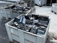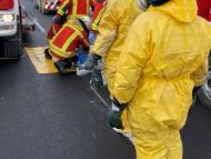 Sicheres Umladen der Beschädigten Batterien in Behälter unter Schutzkleidung.