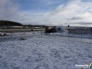 Ein LKW mit Schwefelsäure kam bei Ausfahrt aus einem Rastplatz auf glatter Fahrbahn ins Rutschen und verkeilte sich.
