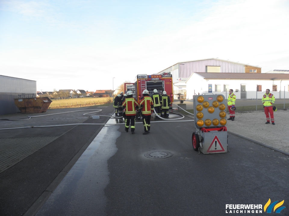 Da der Brand einer Produktionshalle gemeldet war alarmierte die Leitstelle Ulm nach Alarm- und Ausrückeordnung die Drehleiter aus Laichingen sowie die Unterstützungsgruppe örtliche Einsatzleitung.