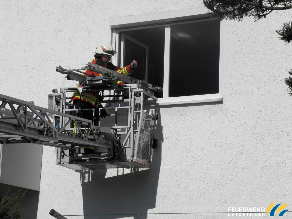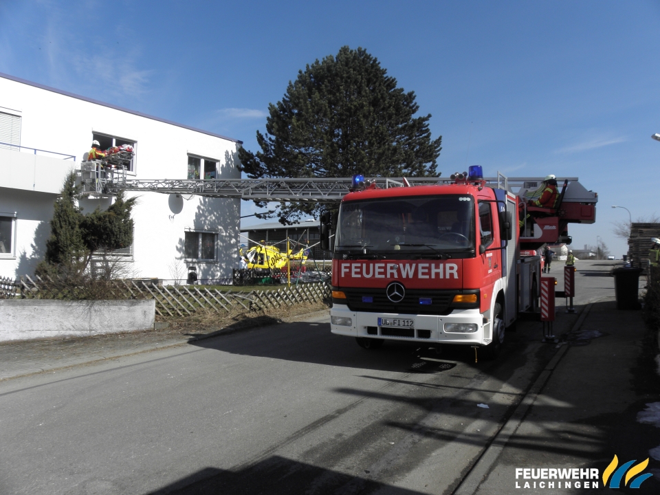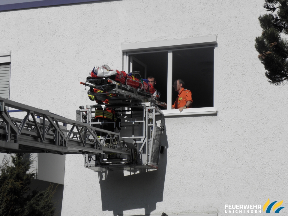 Mit Hilfe der Tragenhalterung der DLK wurde die Person gemeinsam mit dem Rettungsdienst aus dem 1 OG gerettet und an den Rettungshubschrauber übergeben.