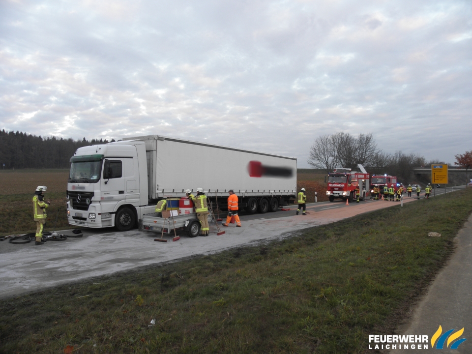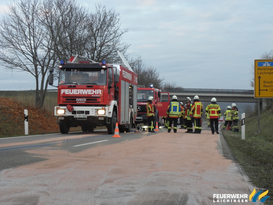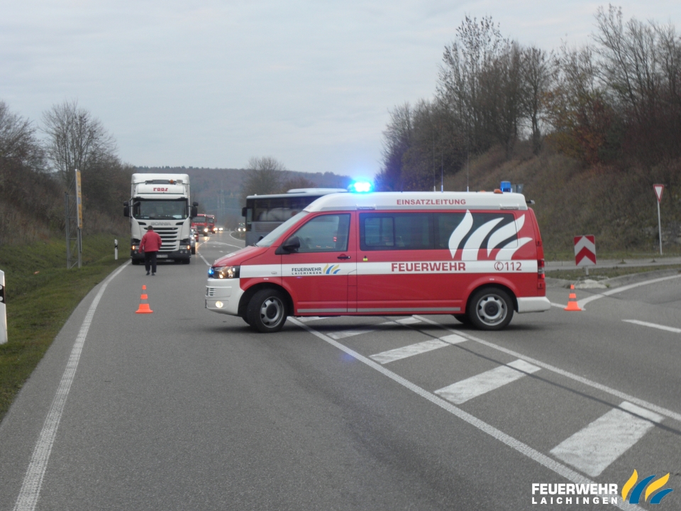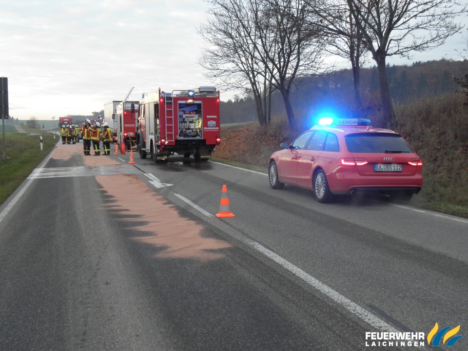 Gemeinsam mit der Feuerwehr Heroldstatt wurde der Brandschutz sichergestellt, der ausgelaufene Kraftstoff mit Bindemittel aufgenommen und zeitgleich versucht das Leck abzudichten.
