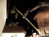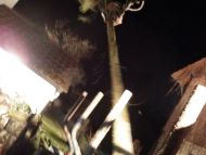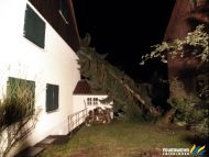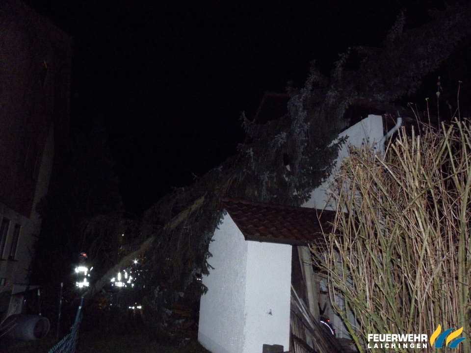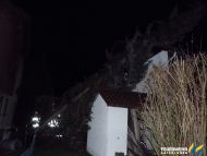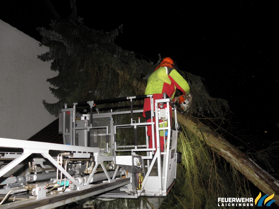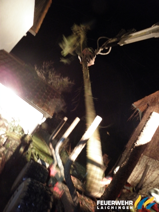 Baum mit Hilfe von Drehleiter und Rückewagen eines hinzugezogenen Holzfällers zerlegt und von Gebäude entfernt.