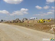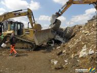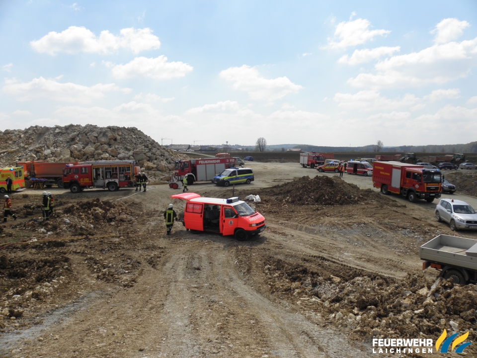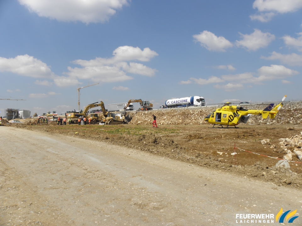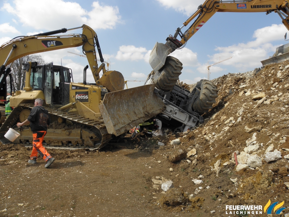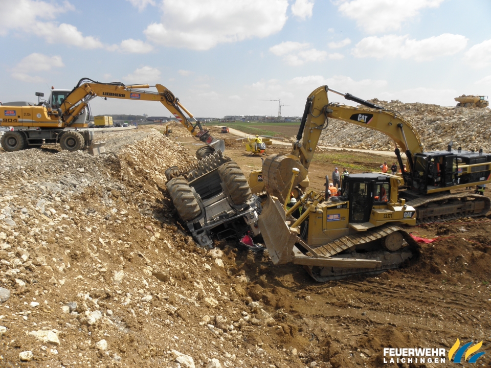 Bis zum Eintreffen der Rettungskräfte war die Baumaschine bereits von den Kollegen des verunglückten mit Baggern und Radladern gesichert.