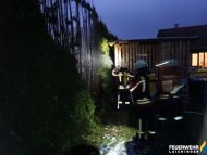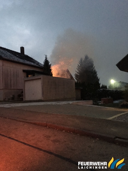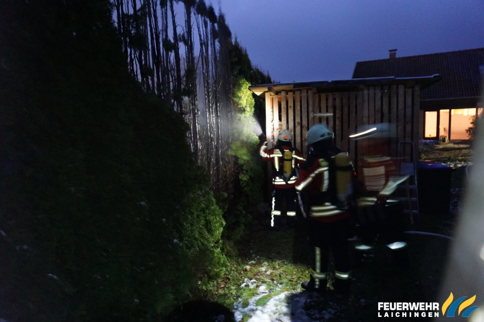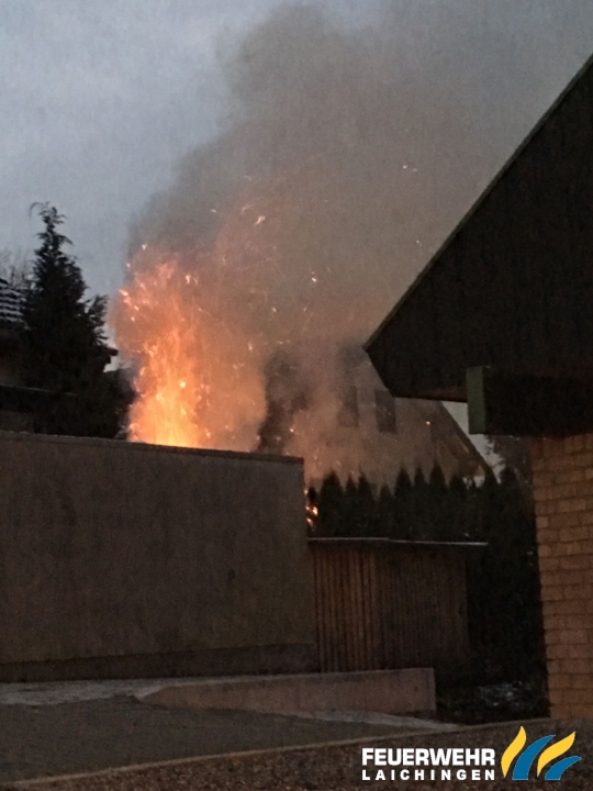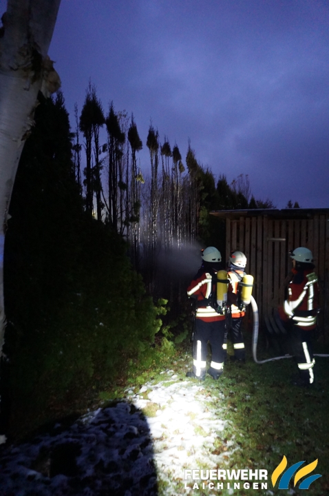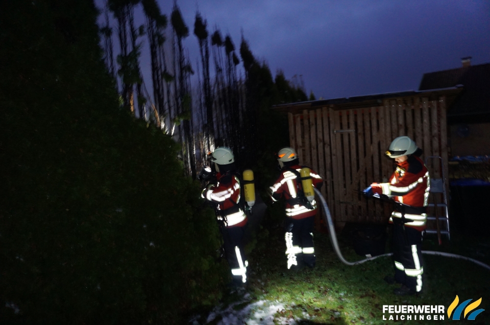 Der gemeldet Dachstuhlbrand entpuppte sich vor Ort als brennende Thuja Hecke welche aufgrund ihrer Größe zu einem anfängliche enormen Feuerschein und Funkenflug führte. Der Brand wurde unter Atemschutz mit einem C Rohr gelöscht. Ein Übergreifen auf die angrenzenden Gebäude konnte verhindert werden. Weitere Fahrzeuge konnten ihre Anfahrt aufgrund der Rückmeldung ohne Eile zur Einsatzstelle fortsetzten. Nach einer abschließenden Kontrolle mit der Wärmebildkamera konnte die Einsatz-stelle dem Hausbesitzer übergeben werden.