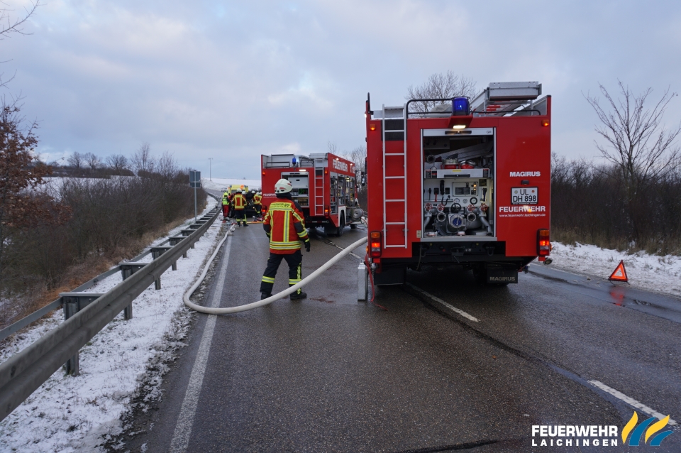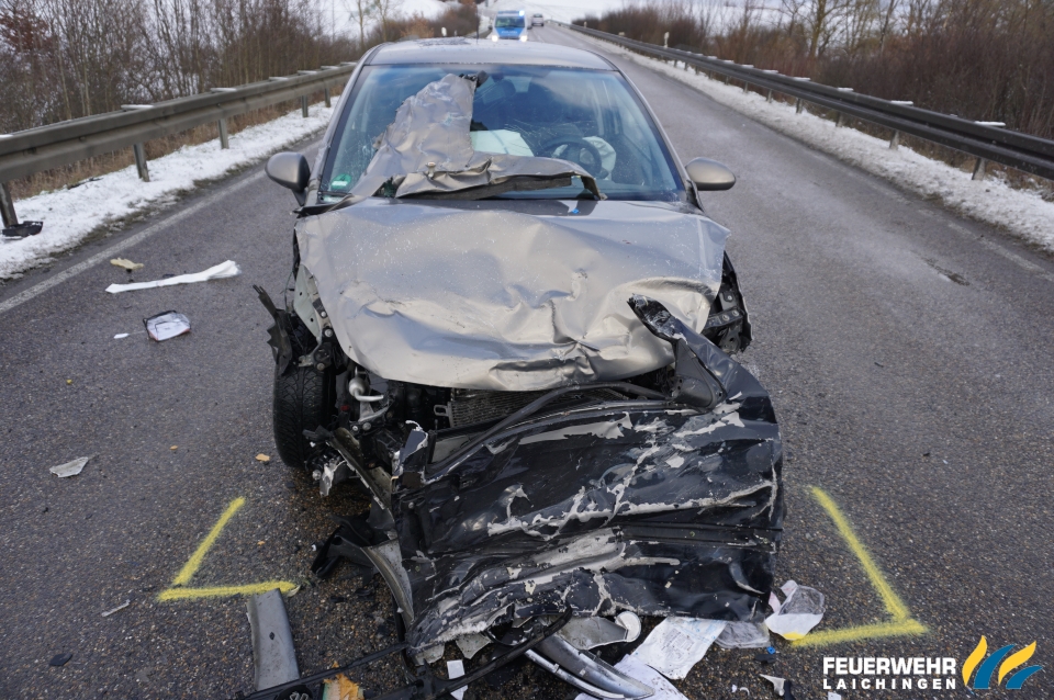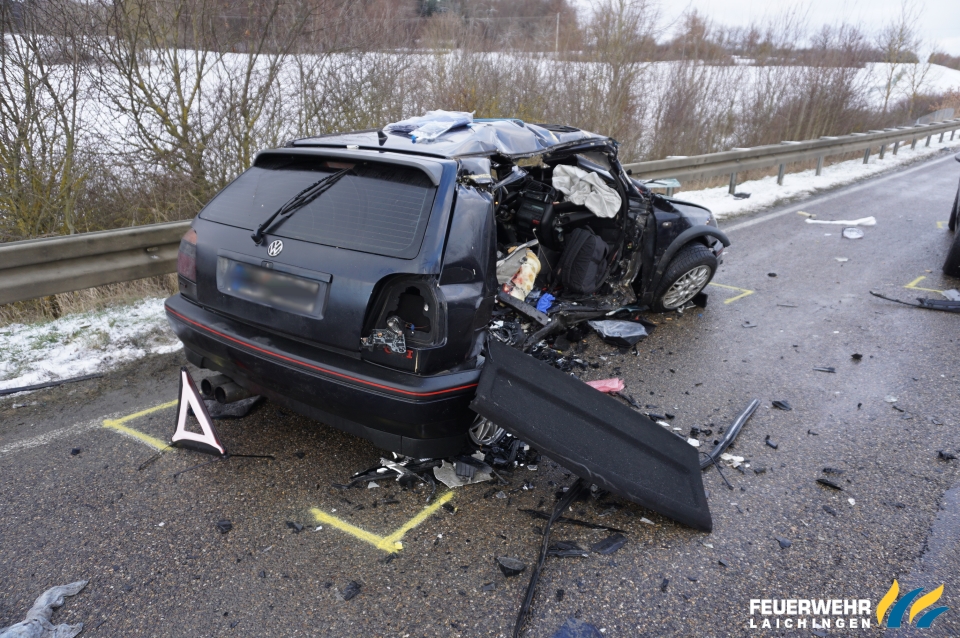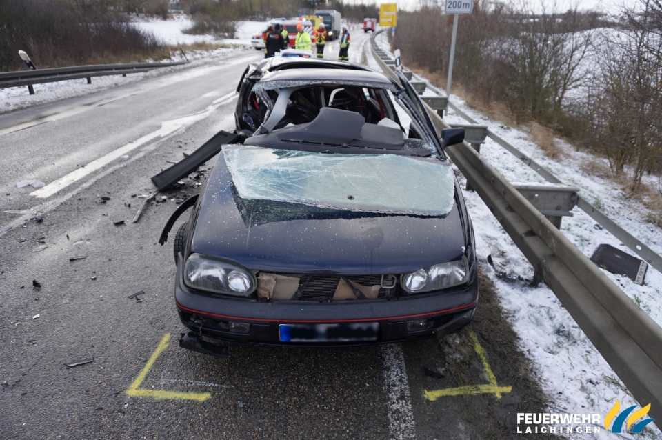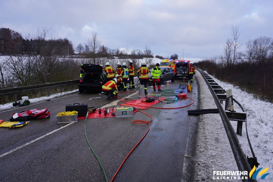 Beim Eintreffen war eine Person bereits durch den Rettungsdienst versorgt und eine weitere noch im Fahrzeug eingeklemmt.