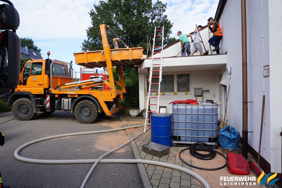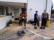 Vor dem Gebäude sowie im Heizungskeller wurde das Öl mit Bindemittel aufgenommen, kontaminierte Einrichtungsgegenstände wurden ins Freie gebracht.