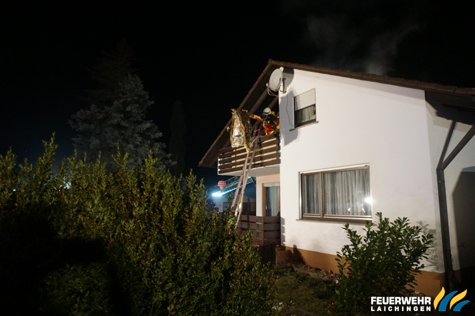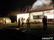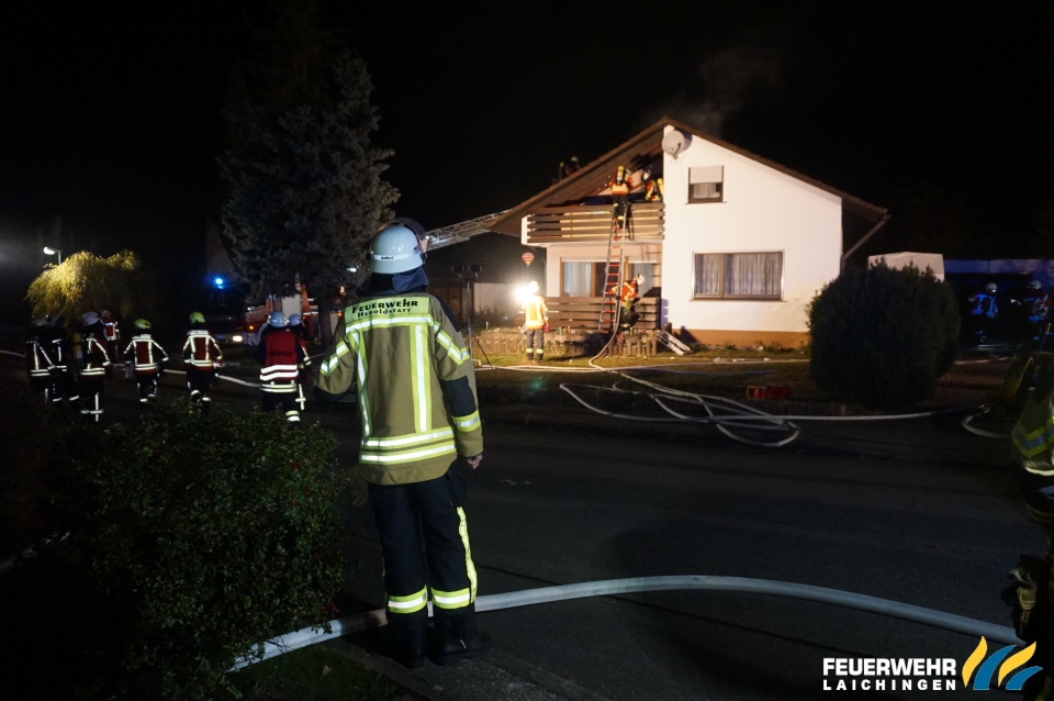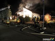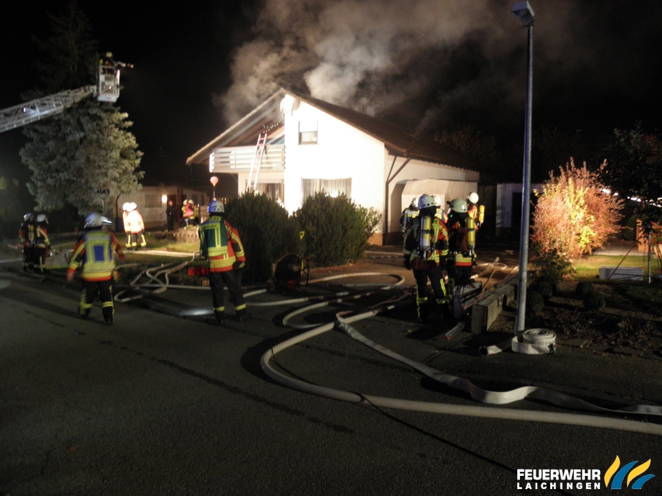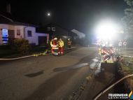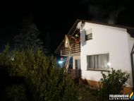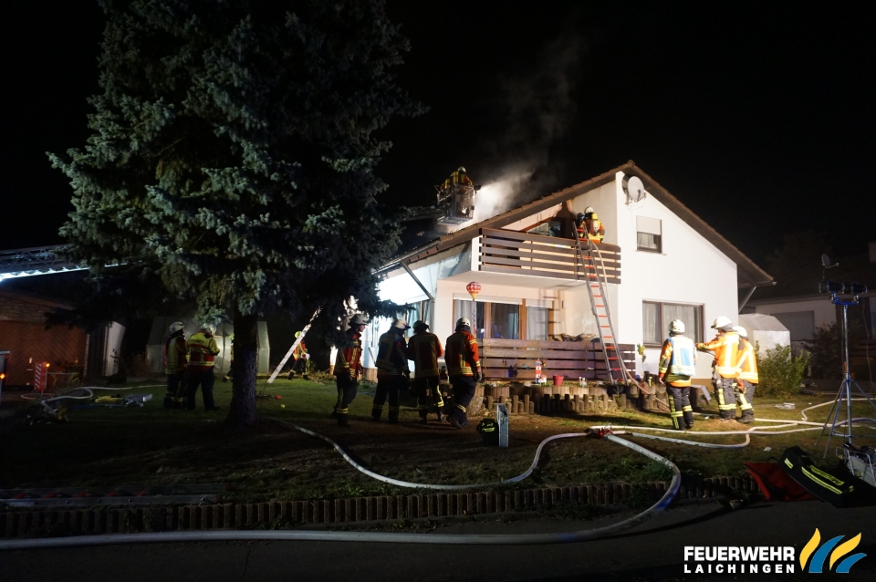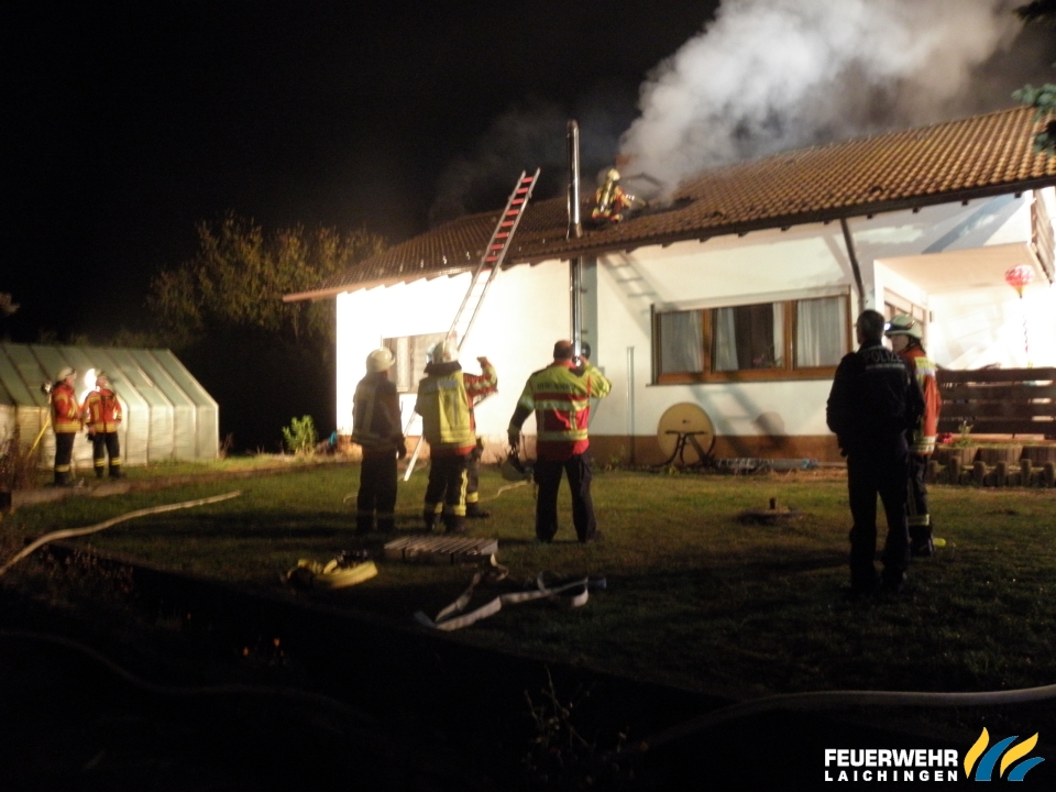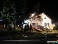 Offene, ca. 3 Meter hohe Flammen aus Dachfenster, keine Personen in Gebäude, zwei Personen vom Rettungsdienst betreut. Als Erstmaßnahmen wurden die Flammen von außen mit zwei C-Rohren bekämpft. Kurze Zeit später begaben sich drei Trupps unter Atemschutz zur Brandbekämpfung mit 3 C-Rohren in den massiven Innenangriff um sehr erfolgreich eine weitere Brandausbreitung auf die Dachhaut und weitere Räume zu verhindern. Danach konnte die Dachhaut von außen geöffnet, weitere Glutnester mit Hilfe der Wärmebildkamera ausfindig gemacht und abgelöscht werden. Ebenso wurde in den zwei betroffenen Räumen die Isolierung entfernt und alle Räume mit Wärmebildkameras kontrolliert.