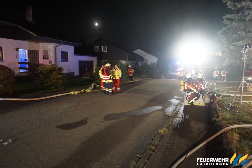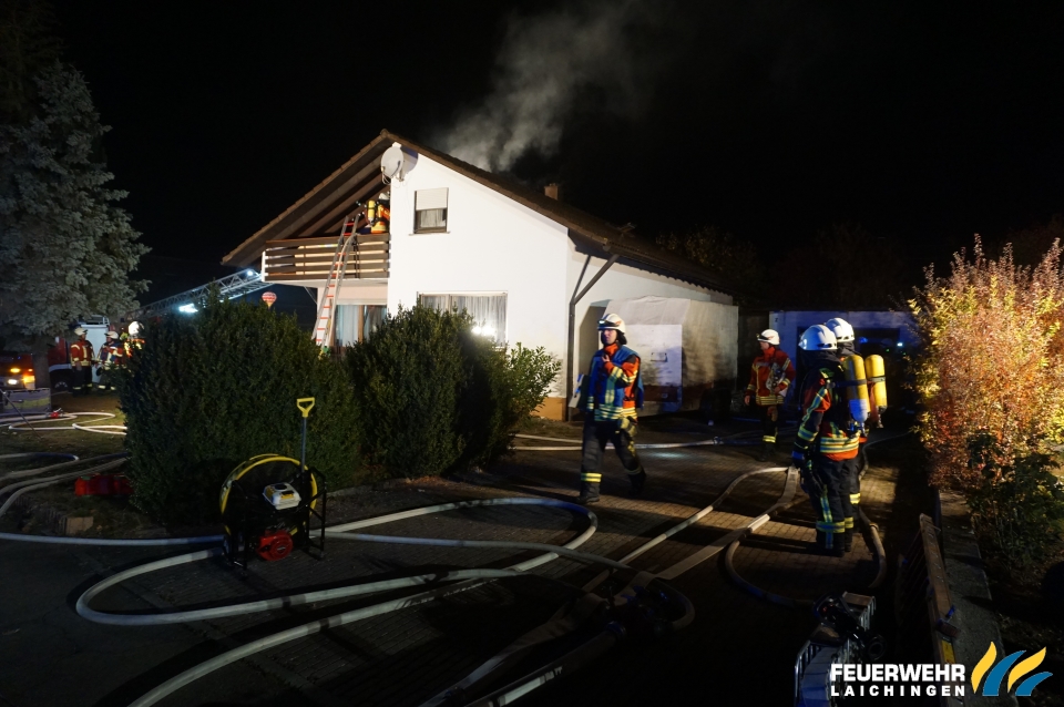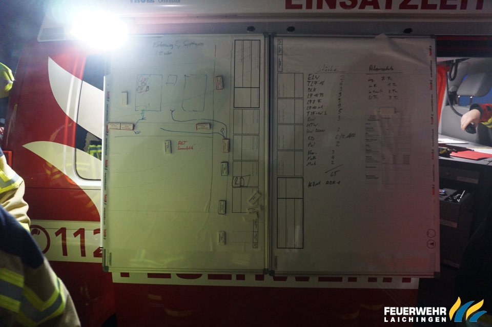 Nach erster Lagemeldung um 1:09 wurde um 1:11 auf B3 Dachstuhl erhöht, dadurch zusätzlich alarmiert: Abteilung Machtolsheim gesamt, Abteilung Feldstetten gesamt, Führungsgruppe und KBM.