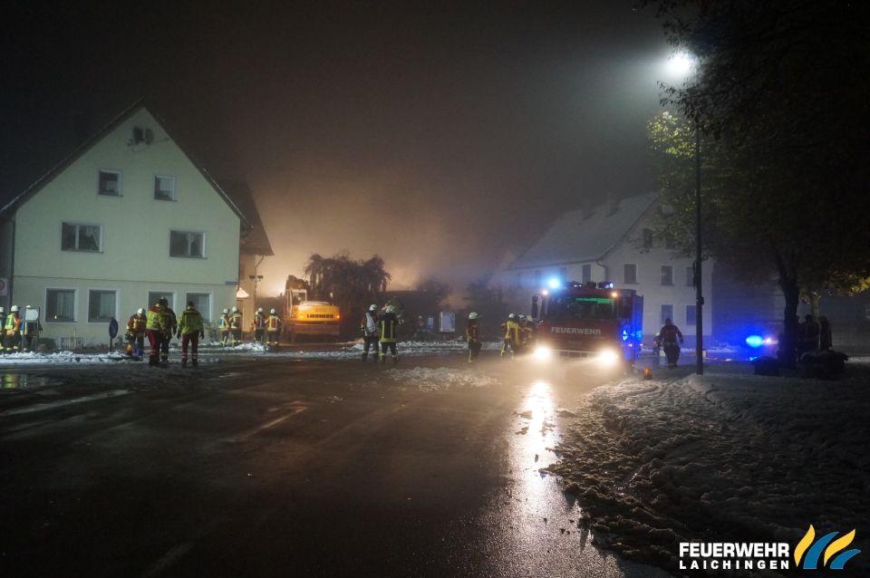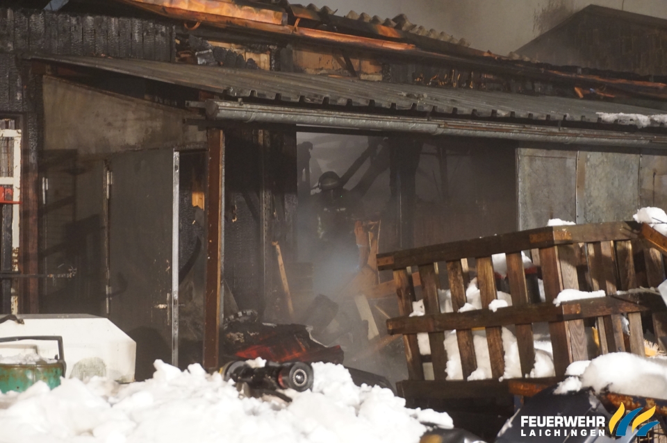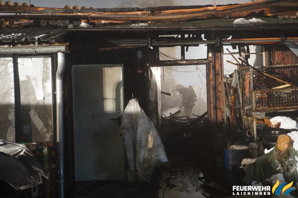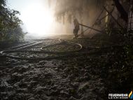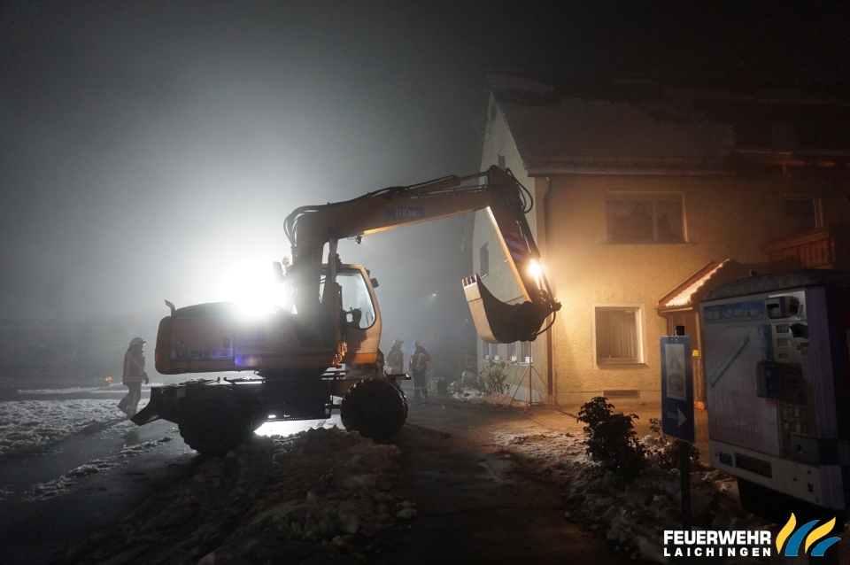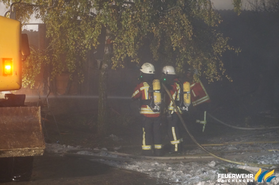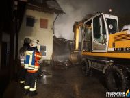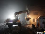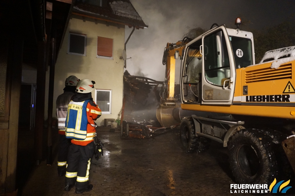Als die Flammen bekämpft waren, wurden unter Atemschutz und Verwendung von Wärmebildkameras die Glutnester abgelöscht. Um das Brandgut auseinander zu ziehen kam zusätzlich ein Bagger zum Einsatz.