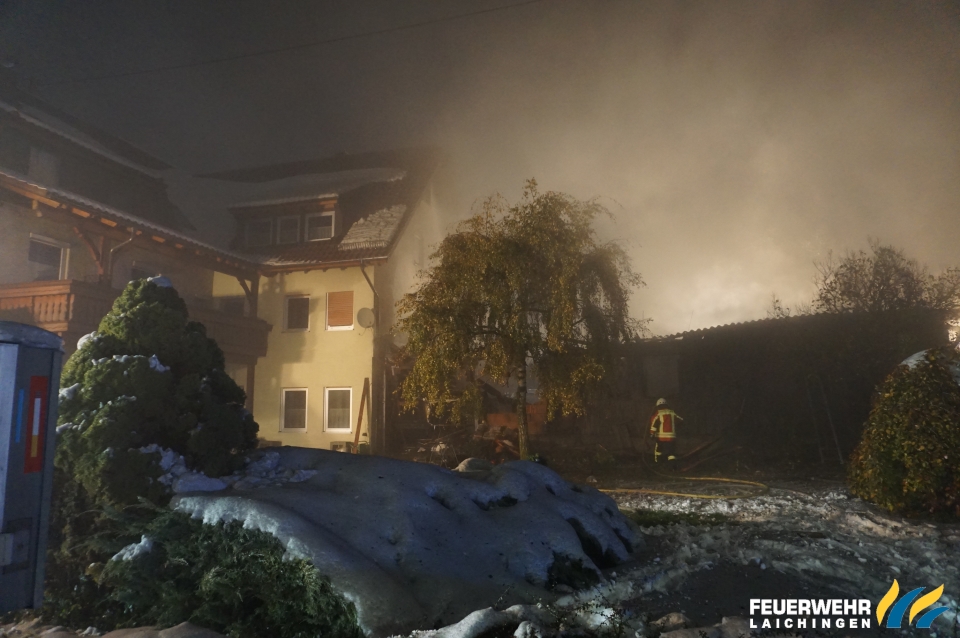 Beim Eintreffen stand ein Garagen/ Werkstatt Anbau unter enormer Rauchentwicklung im Vollbrand.