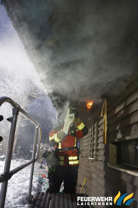 Im weiteren Verlauf mussten Teiles des Dachs geöffnet werden, der Brandschutt ins Freie gebracht und weiter Glutnester mit der Wärmebildkamera gesucht und bekämpft werden.