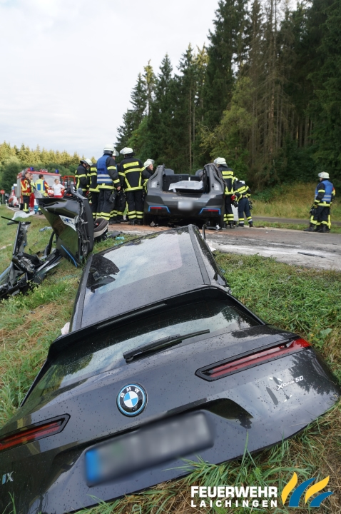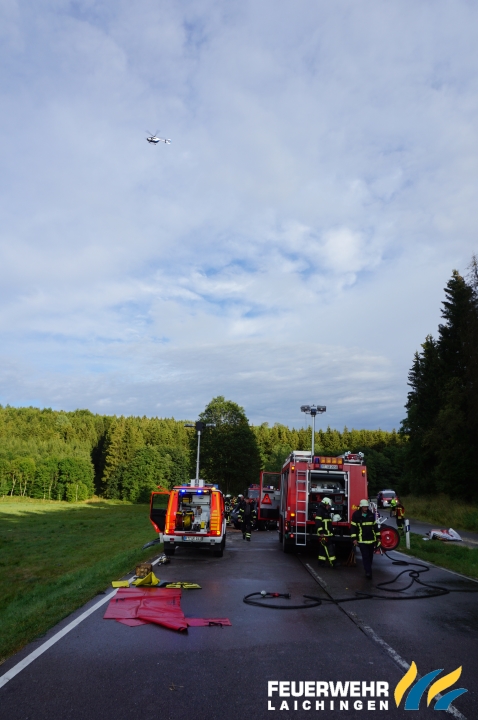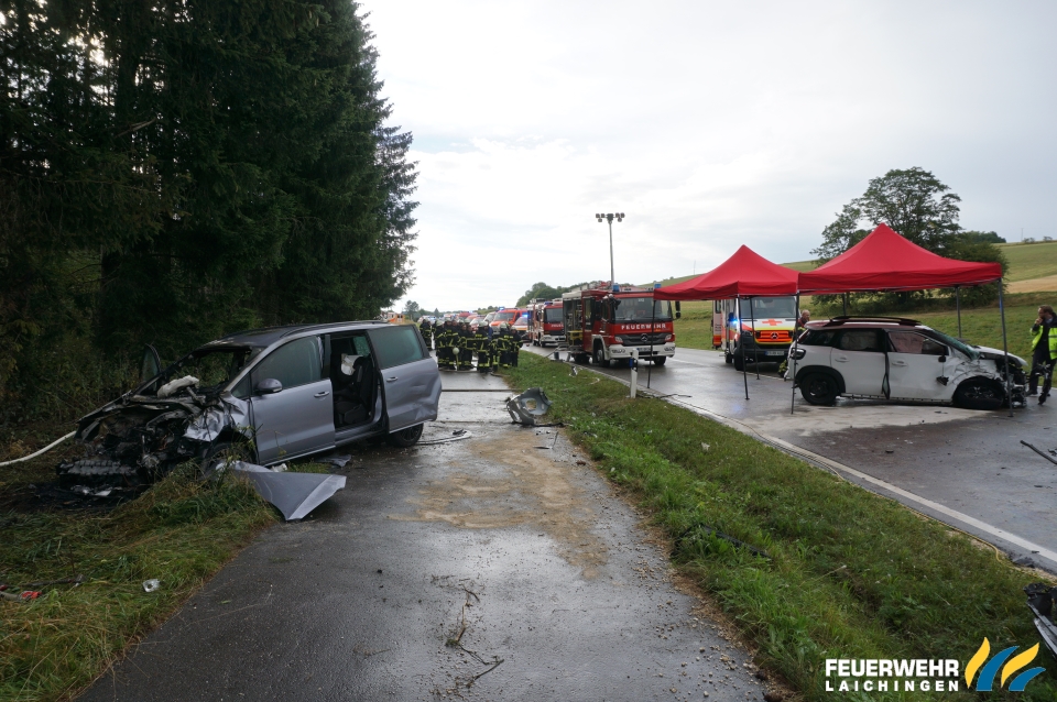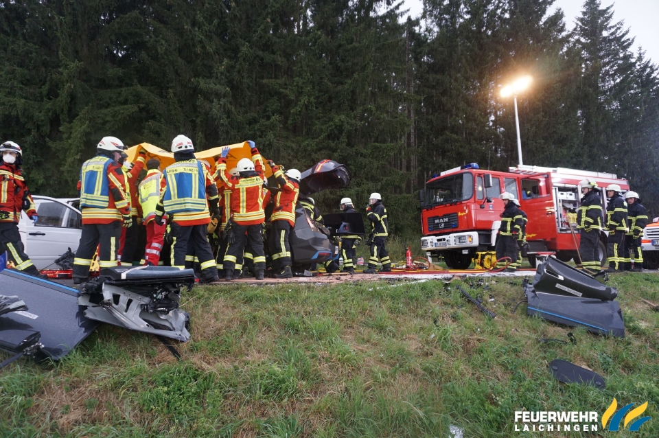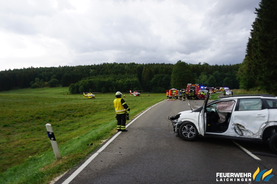 Auf Anfahrtsseite der Feuerwehr Laichingen befanden sich 4 Personen in einem PKW eingeschlossen 2 schwerstverletze Personen befanden sich außerhalb der 2 Fahrzeuge.
