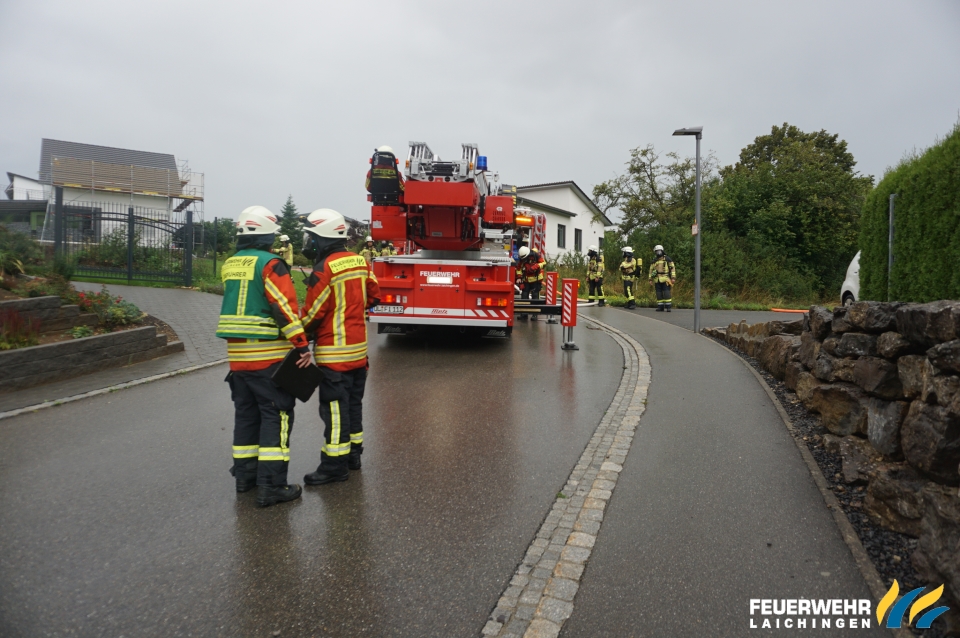 Beim Eintreffen der Drehleiter war das Innere des Gebäudes bereits durch die Kammeraden aus Heroldstatt kontrolliert.