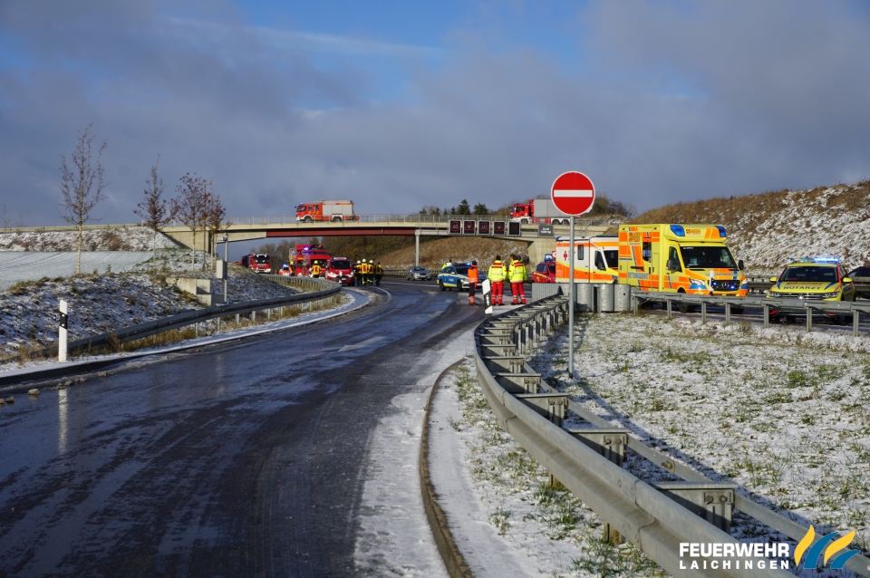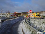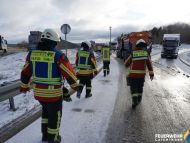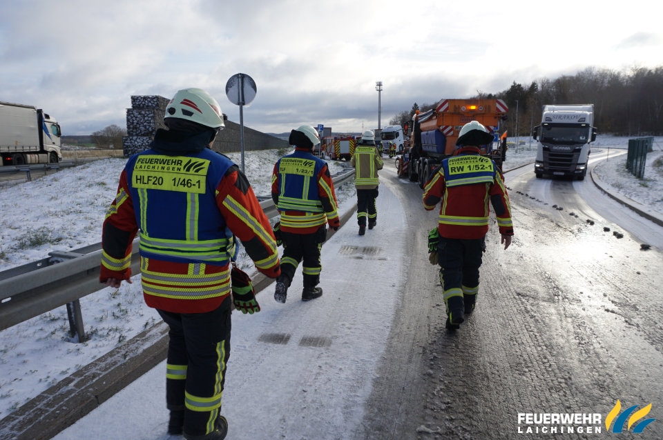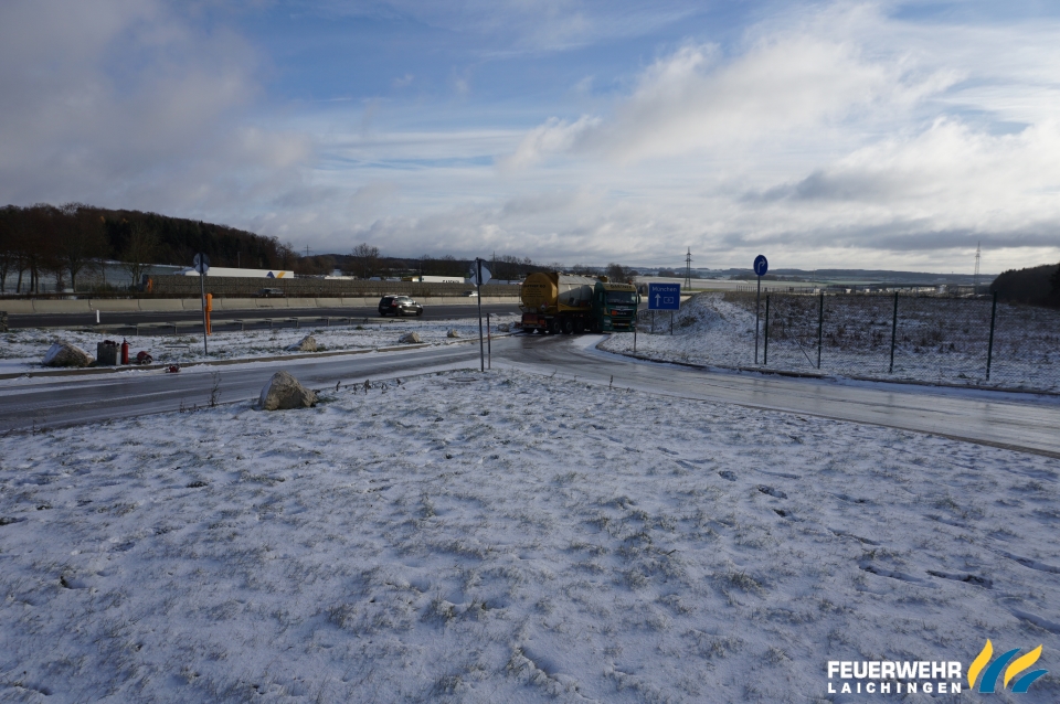 Ein LKW mit Schwefelsäure kam bei Ausfahrt aus einem Rastplatz auf glatter Fahrbahn ins Rutschen und verkeilte sich.