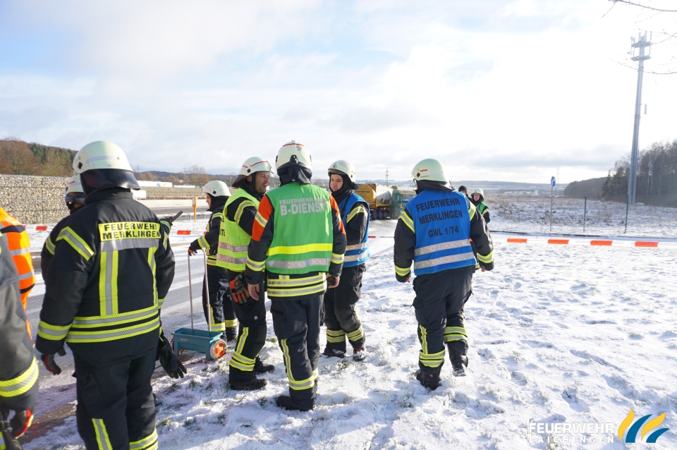 Die Einsatzstelle konnte großflächig zurück gebaut werden und der LKW wurde vom Abschleppdienst nach Merklingen geschleppt.