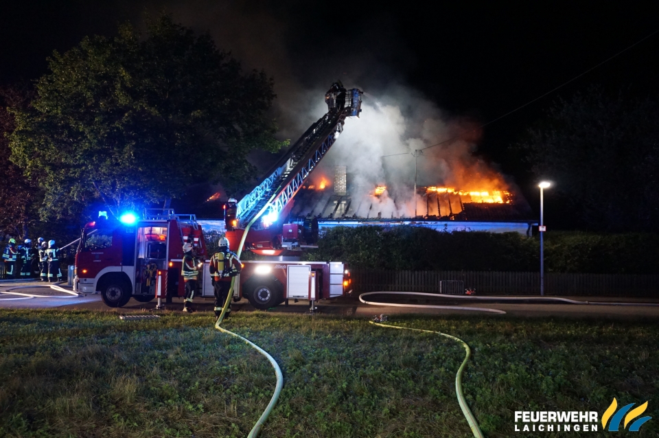 Die Feuerwehr Laichingen unterstütze mit der Drehleiter beim Ablöschen des Brandes.