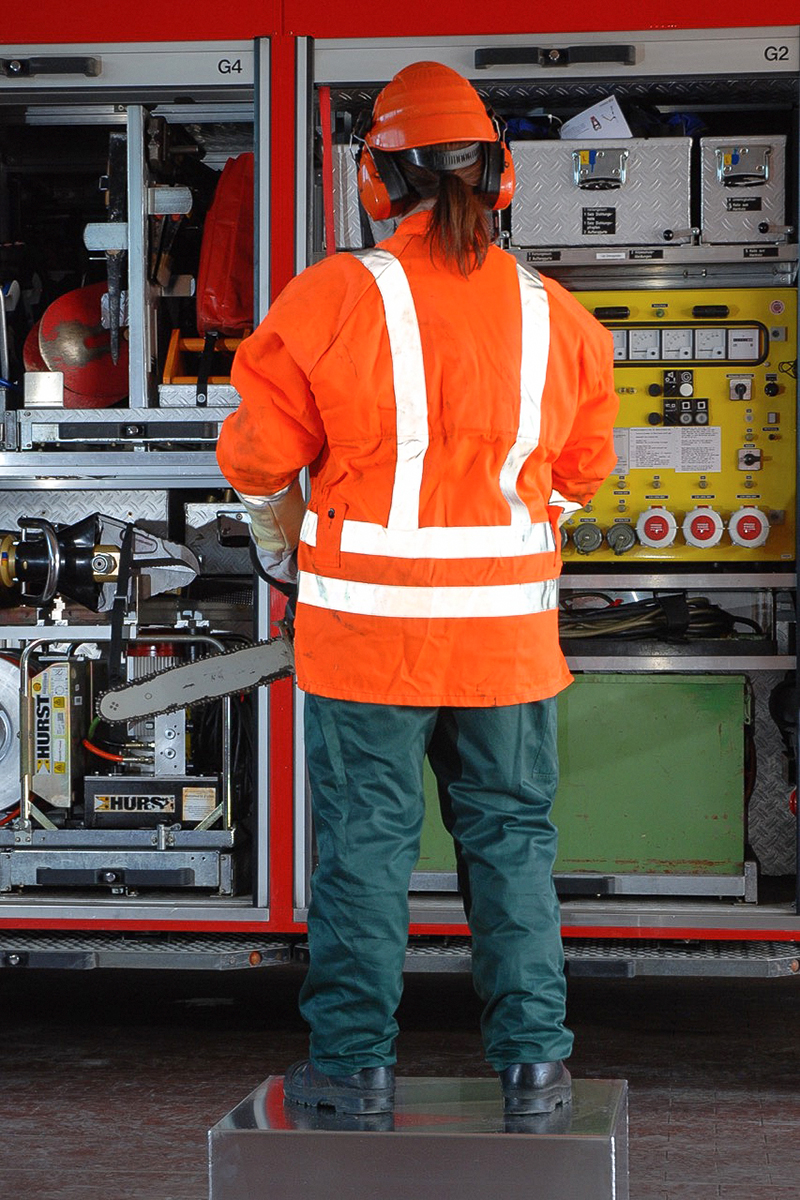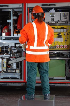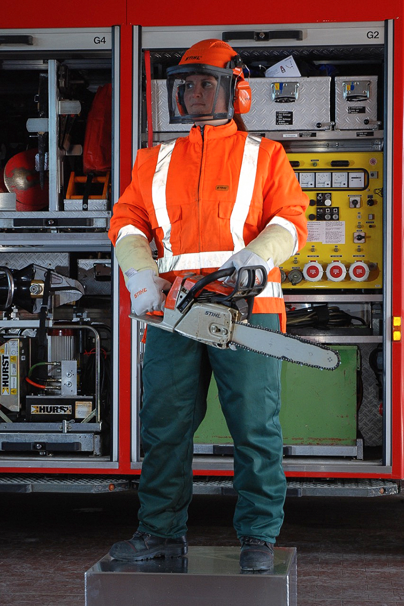 Bei Arbeiten mit der Motorsäge muss spezielle Forstschutzkleidung getragen werden. Diese besteht aus einer Schnittschutzhose oder Schnittschutzbeinlingen sowie einem Forsthelm mit Gesichts- und Gehörschutz.